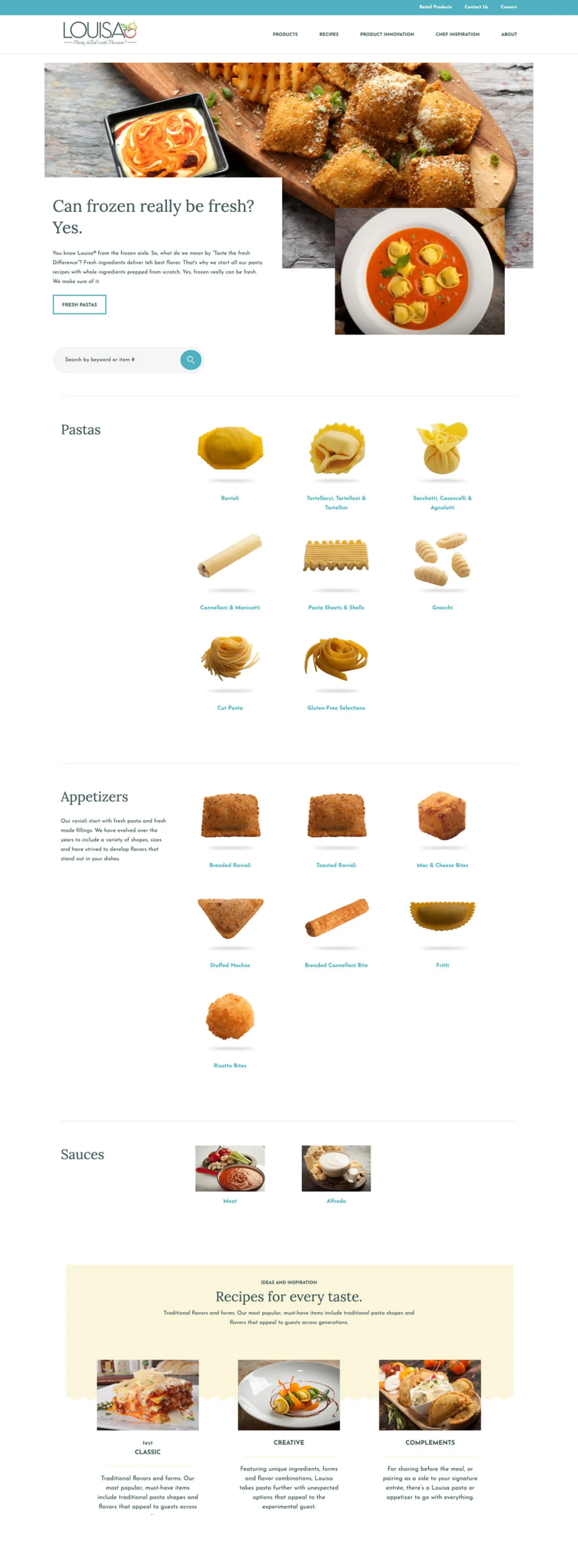 Louisa Foods is a St. Louis based, family-owned business started more than 55 years ago. They prepare fresh-made pastas, appetizers, & sauces. Our goal was to create a website that showcased the diverse set of products they carry, how to get them, and inspire others to create dishes that nonna would be proud of.