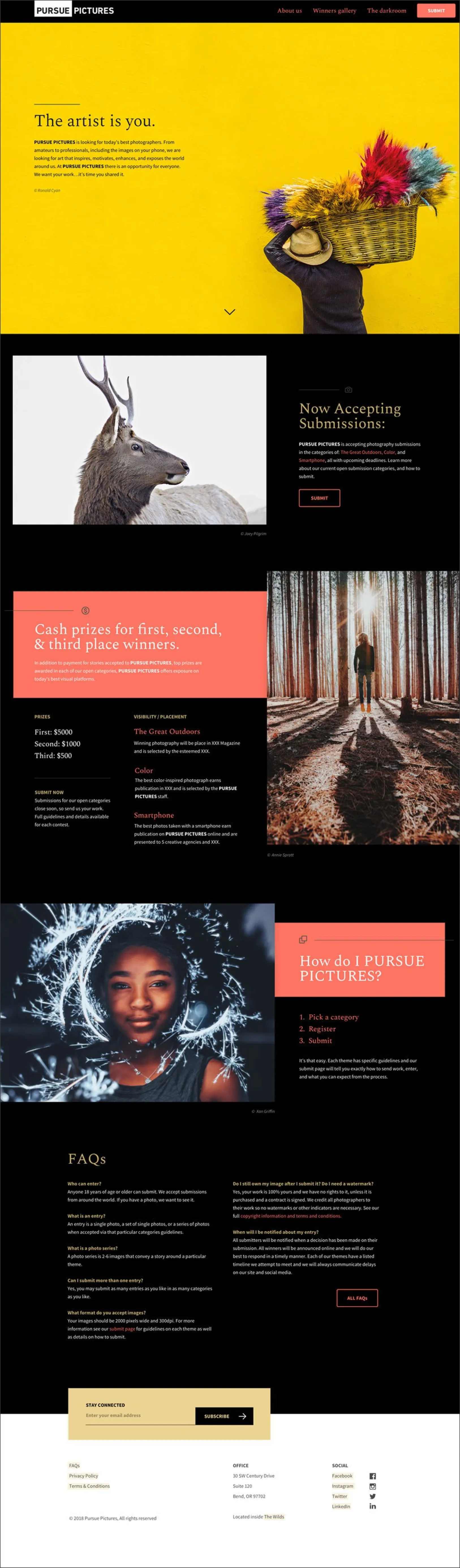 Pursue Pictures aims to take their success in the literary arts and apply it to photography. Using their specific expertise to place photographers in commercially viable, high-quality platforms, it is unique in the arena of visual storytelling. Turn was tasked with concepting a highly visual and engaging platform that would allow Pursue Pictures to raise awareness, share their story and gain submissions for their photography contests.