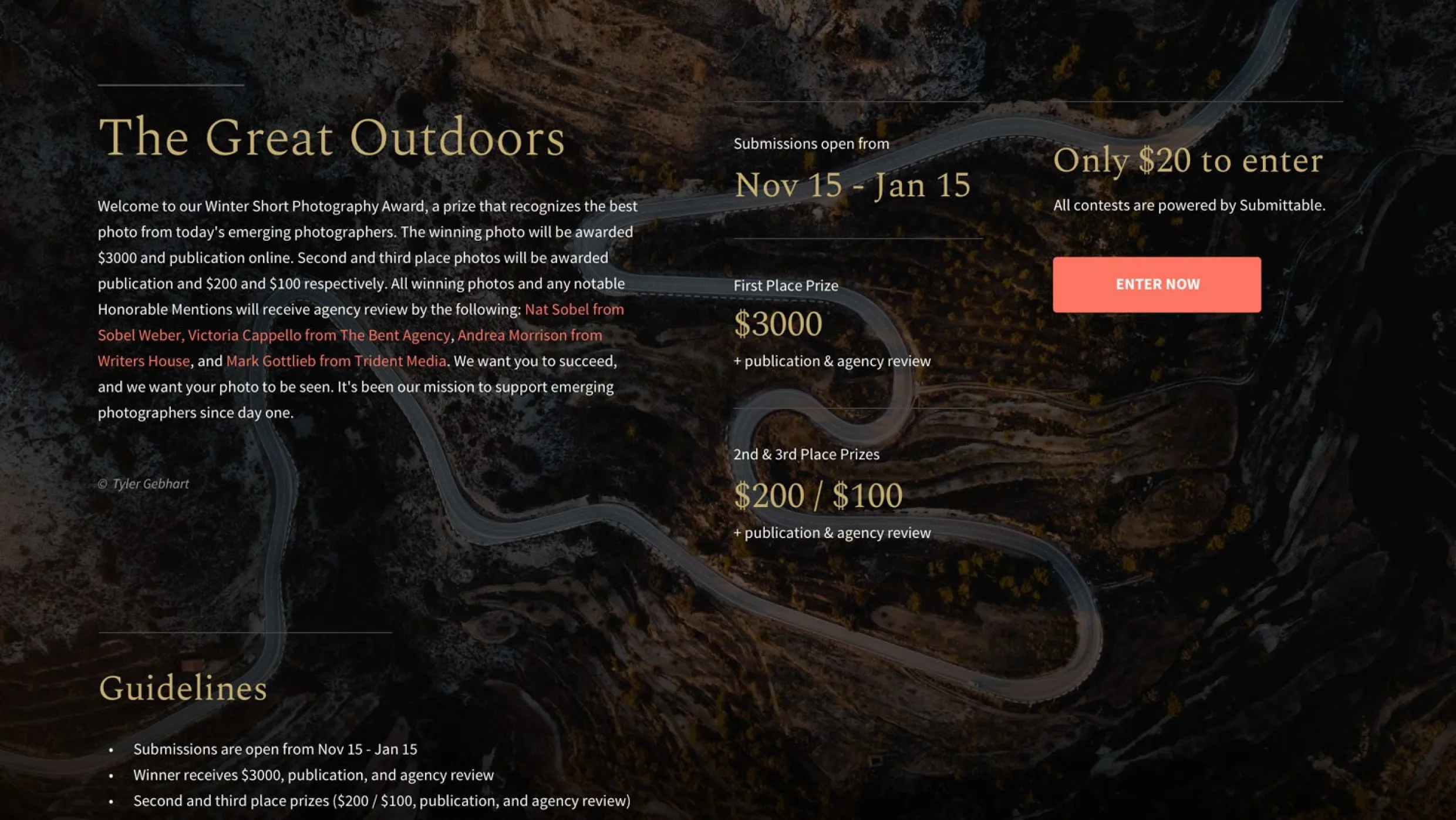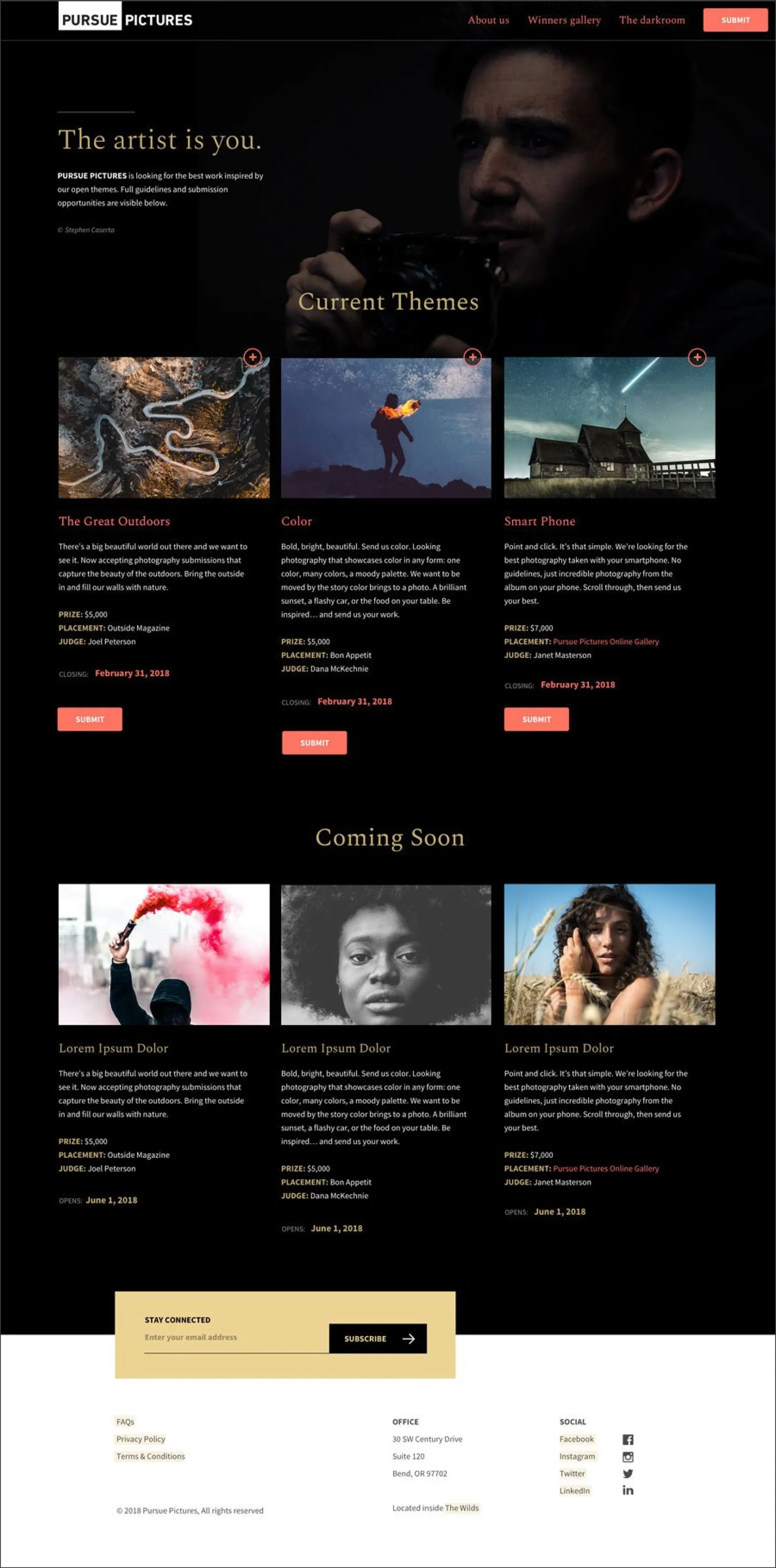 Concept and design of a platform to discover emerging photographers. Pursue Pictures offers monetary awards to the winners of their online photo contests. Start submitting!