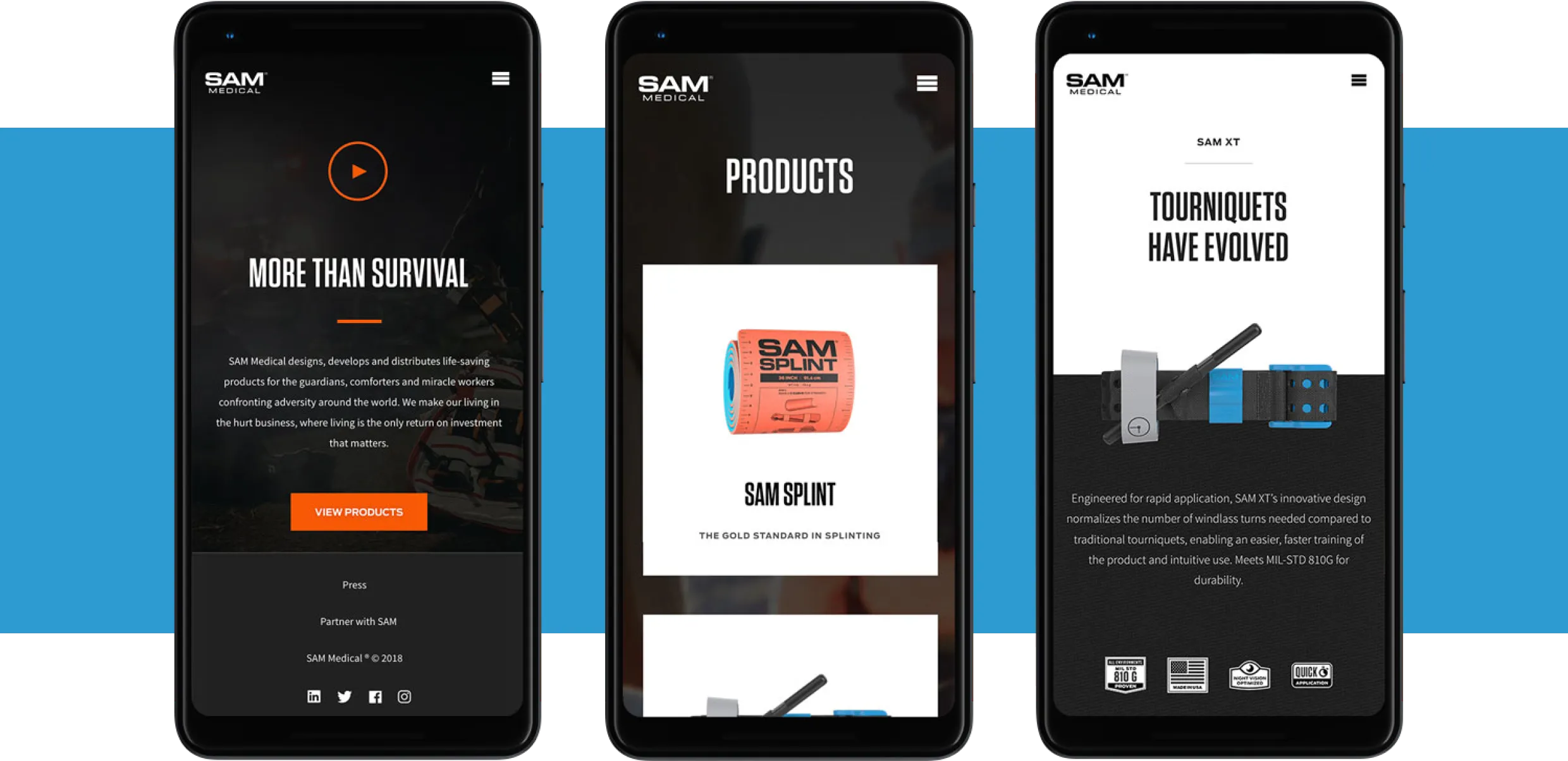 SAM Medical designs, develops and distributes life-saving products for the guardians, comforters, and miracle workers who confront adversity around the world. The goal was to design a website that would live up to their amazing products.