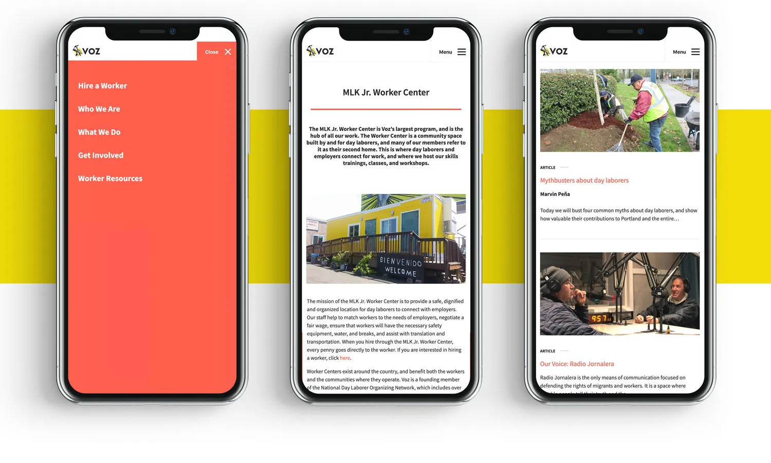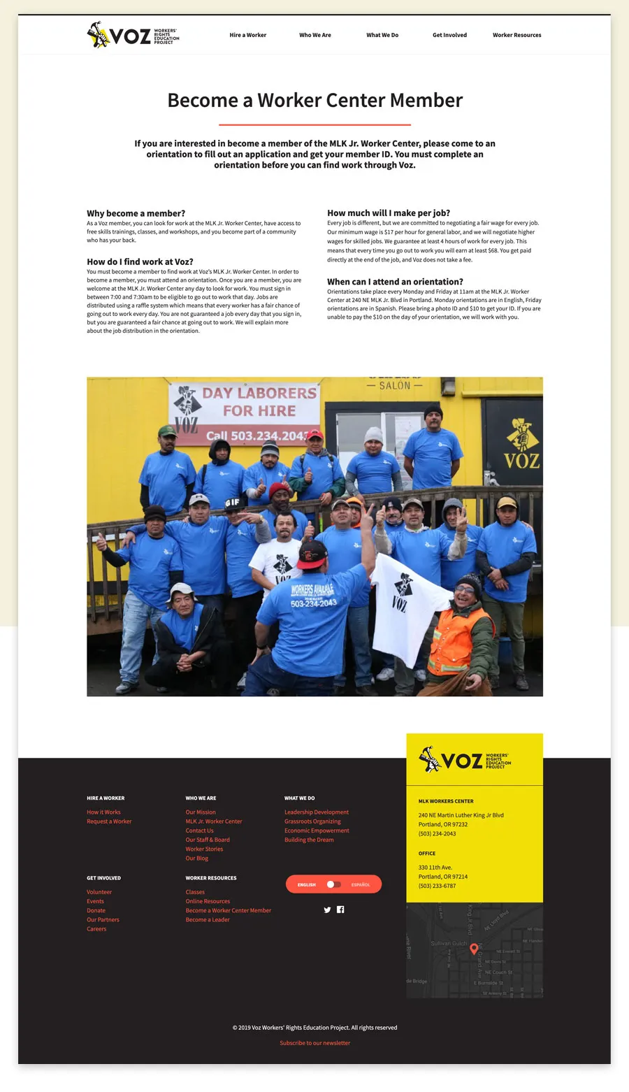 Turn Agency conducted a workshop with Voz that helped uncover the needs within the organization. With their new website, Voz can tell the mission of the organization as well as the rich history behind it. The faces of Voz is a concept that allows the user to learn the stories of day laborers and Voz staff. The blog and events section help keep the community in touch with what is going on at Voz and the easy-to-use worker request form allows companies to legally hire day labor help quickly online.